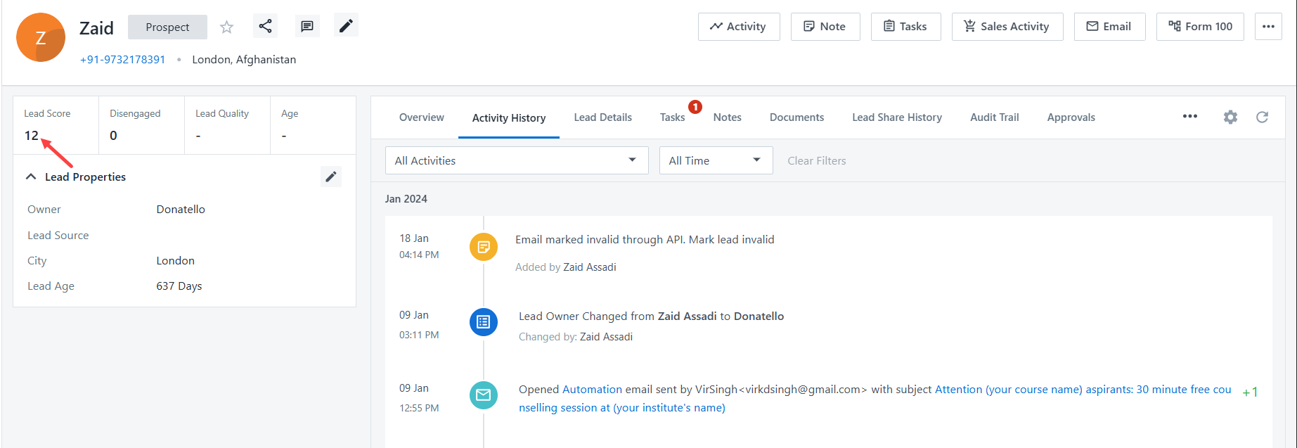 Once the quality scores are available, you can view it on the lead’s Lead Details page.