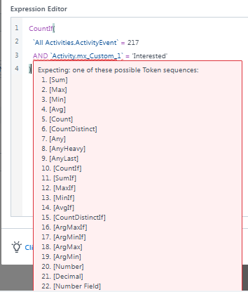 - Aggregated Expressions – An aggregate expression uses an aggregate function to summarize a selected metric. These include expressions like Count, CountDistinct, Sum, Min, Max, and Avg.