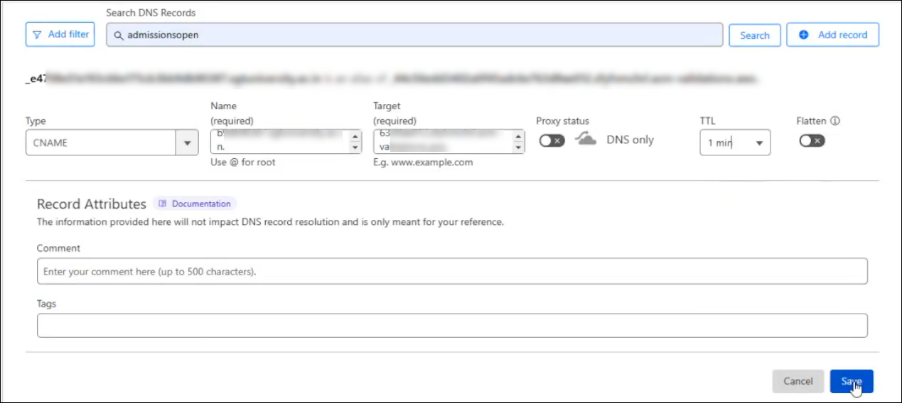 - Click on the DNS settings for the selected URL and create a new CNAME record entry. Paste the above values in the Name (or host) and Value (or Target) fields, respectively.